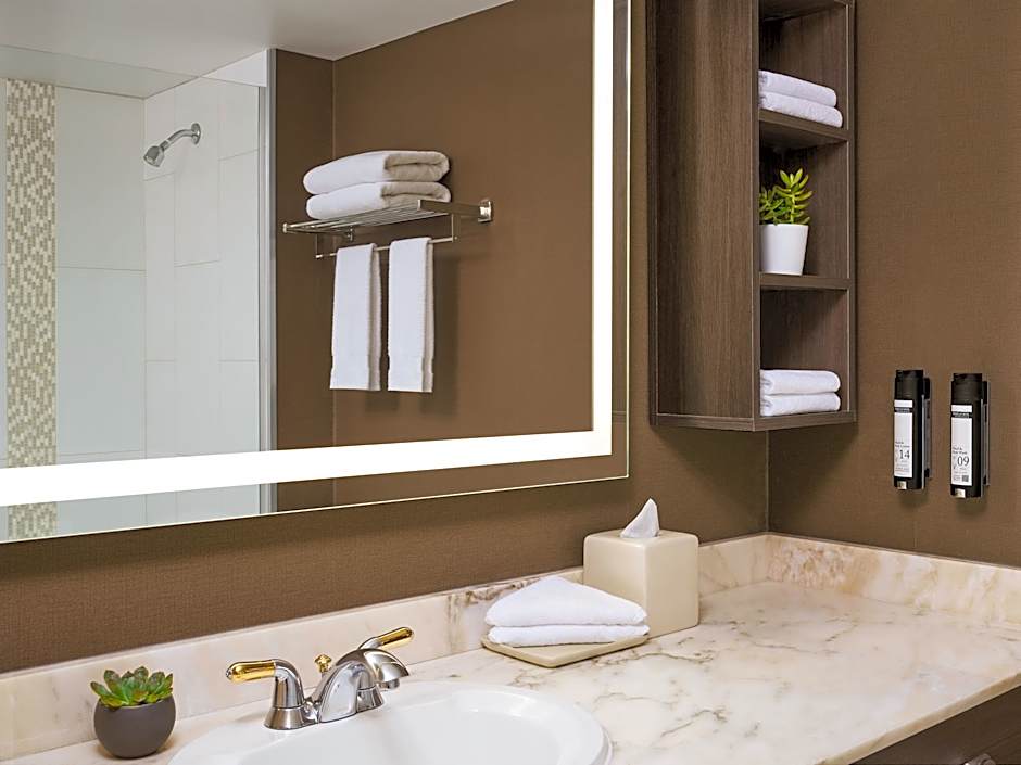 The room offers a 40" HD LED TV with deluxe channels, a Keurig coffee machine, refrigerator, and free bottle of water. A hair dryer, free toiletries, and bathrobes are provided in the bathroom. An iron and ironing board are included. Free WiFi is available.
